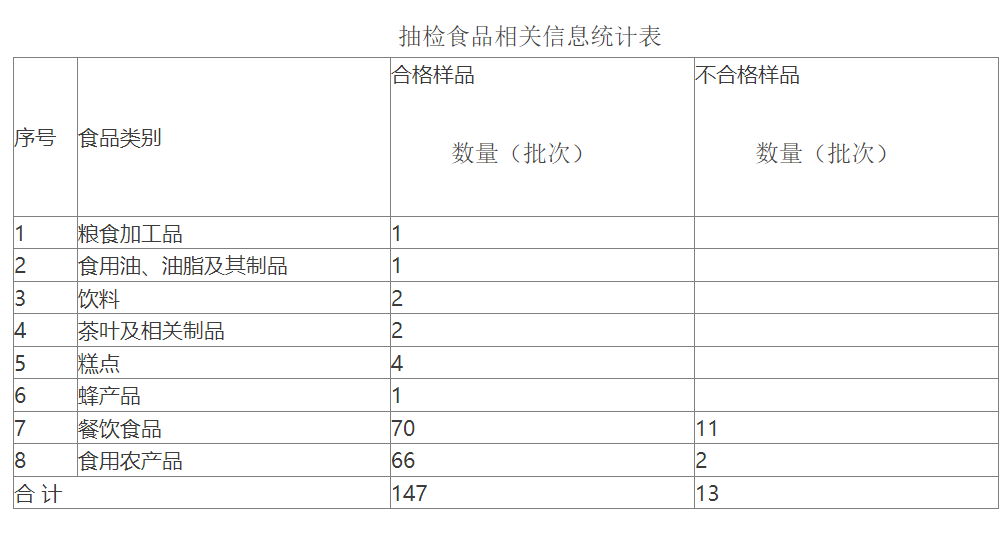 根据《中华人民共和国食品安全法》及其实施条例等规定,为确保广大人民群众“舌尖上的安全”,宜昌市市场监管局组织食品安全监督抽检,涉及食用农产品、餐饮食品、茶叶及相关制品、糕点等8类160批次样品,抽样检验项目合格样品147批次,不合格样品13批次。具体情况公告如下: